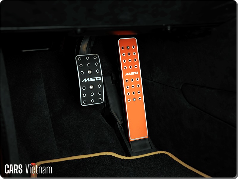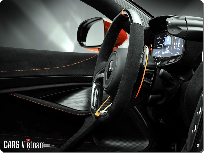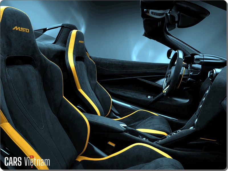 Bên trong khoang lái, 750S Spider MSO Orange Coriolis tiếp tục thể hiện khả năng cá nhân hóa sâu. Các chi tiết chỉ khâu, vô-lăng, bàn đạp, thảm sàn và tựa đầu đều được nhấn bằng tông cam tương phản. Ghế đua Carbon Fiber với cấu trúc hai lớp cải tiến giúp giảm 33% trọng lượng so với ghế tiêu chuẩn, mỗi vỏ ghế chỉ nặng 3,35 kg, hướng đến trải nghiệm lái thuần chất thể thao.