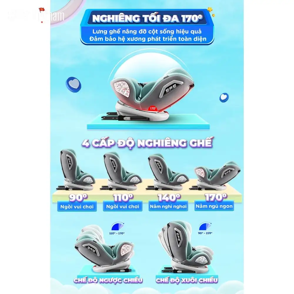 – 4 cấp độ nghiêng ghế: nghiêng tối đa 170 độ cho bé tư thế ngồi thoải mái